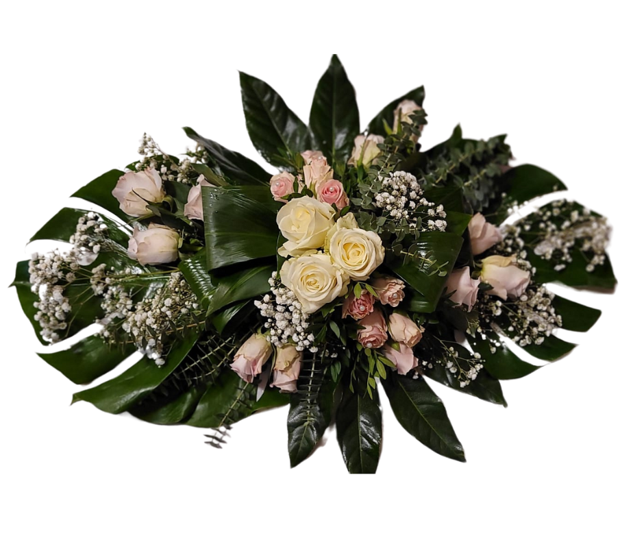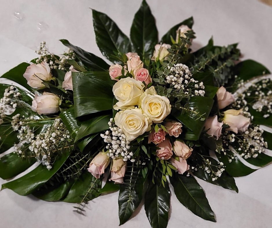 Een liggend bloemstuk dat op de motorkap van de trouwauto bevestigd kan worden, en dat luxe en romantiek uitstraalt.