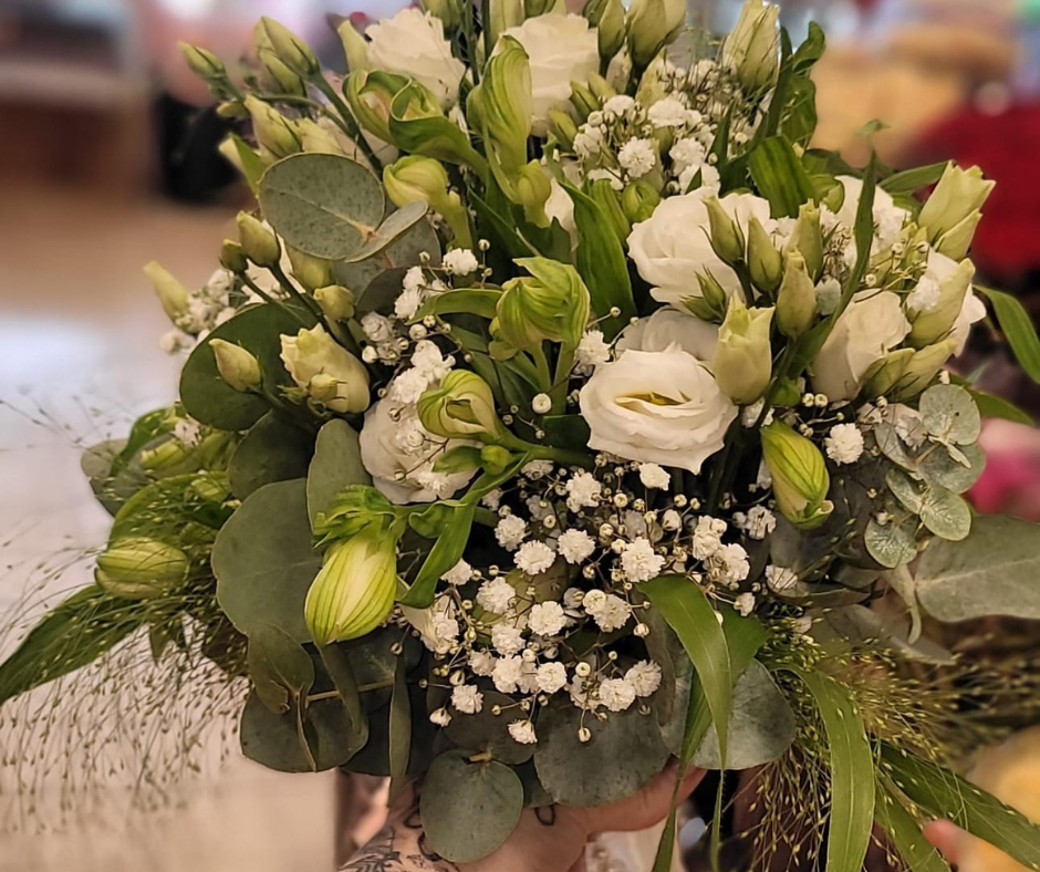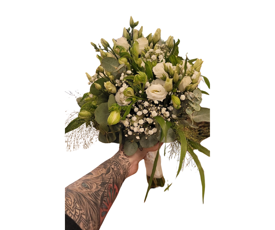 Een verfijnd handgebonden bruidsboeket in zachte wit- en groentinten, met elegante lisianthus, alstroemeria, gipskruid en eucalyptus. Dit boeket ademt ingetogen schoonheid en symboliseert een rustige, oprechte start van jullie leven samen. Ideaal voor een stijlvolle bruiloft met een natuurlijke of moderne uitstraling.