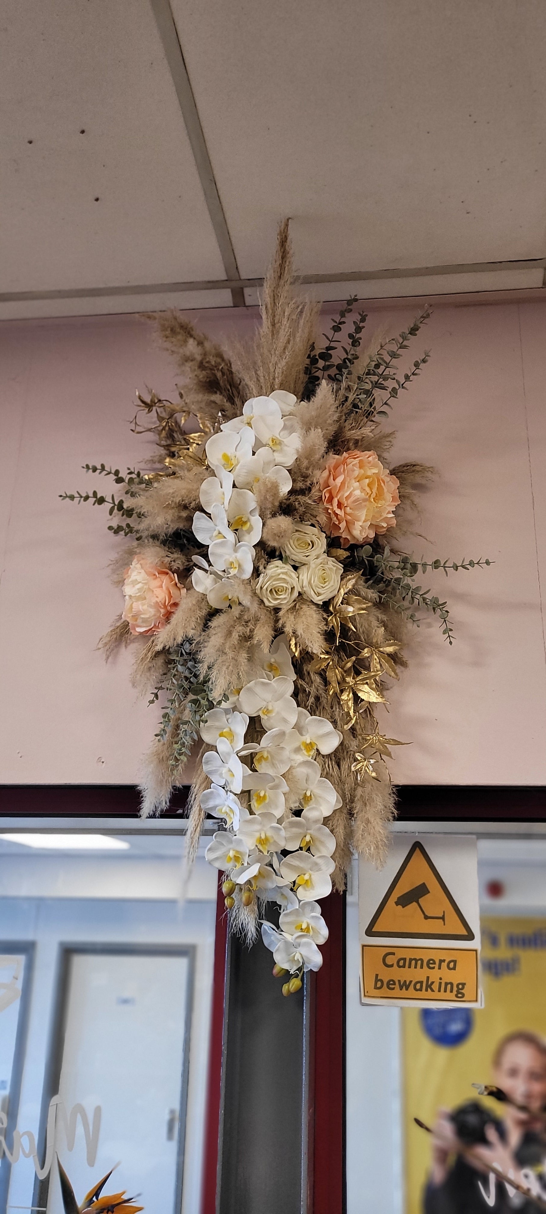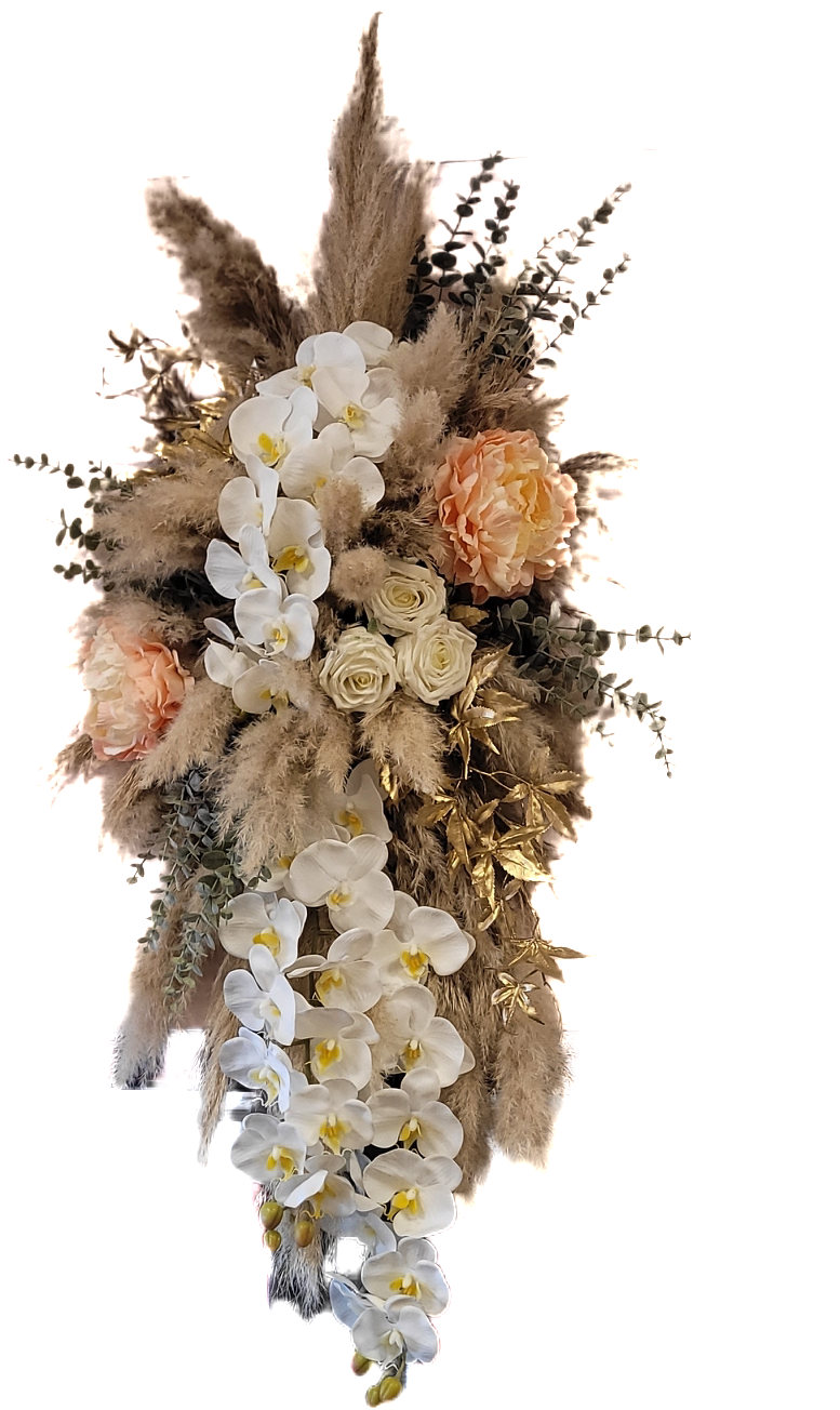 Dit verfijnde kunstzijdeboeket voor aan de muur straalt een mix van natuurlijke rust en luxueuze charme uit. Het bouquet combineert de zachte textuur van pampasgras met een overvloed aan witte orchideeën, aangevuld met subtiele perzikkleurige en crème rozen. De gouden accenten voegen een vleugje glamour toe, terwijl de eucalyptustakjes zorgen voor een frisse, natuurlijke uitstraling. Perfect om een stijlvolle en warme sfeer te creëren in elke ruimte.