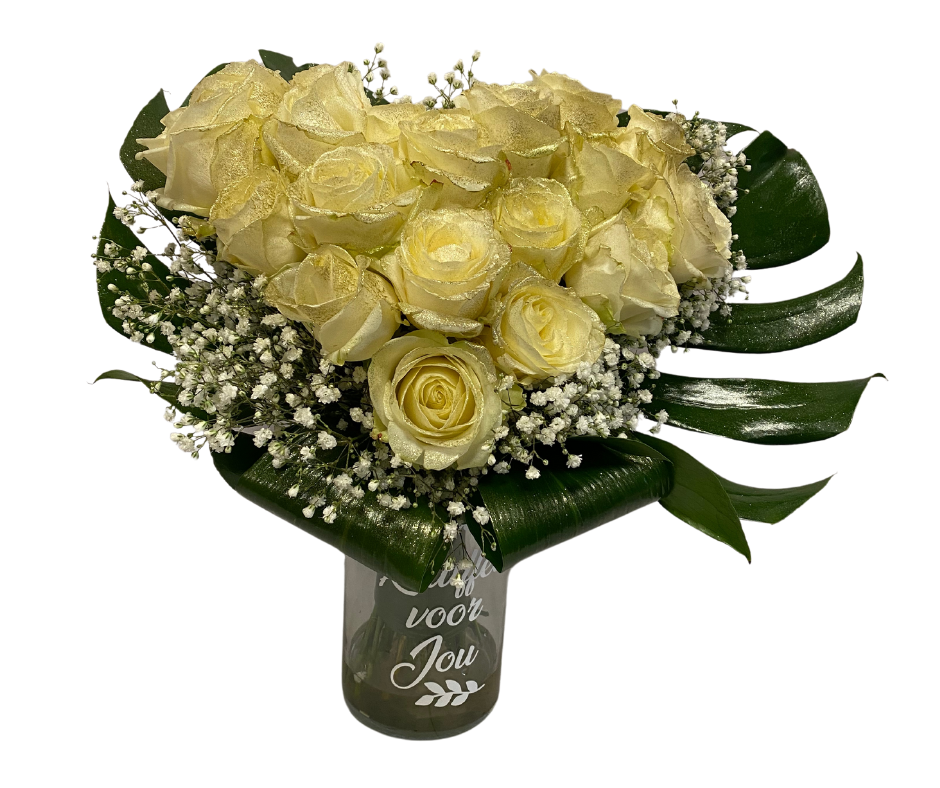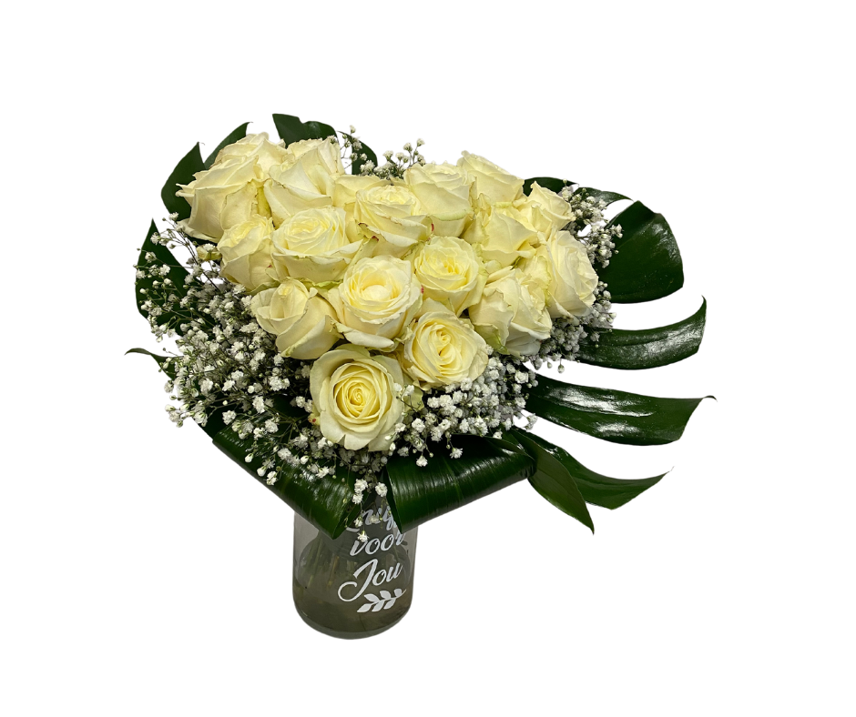 Een elegant en tijdloos trouwboeket, waarin de schoonheid van witte rozen centraal staat. Omgeven door delicaat gipskruid en glanzend groen blad, straalt dit arrangement puurheid, liefde en een eeuwige belofte uit.