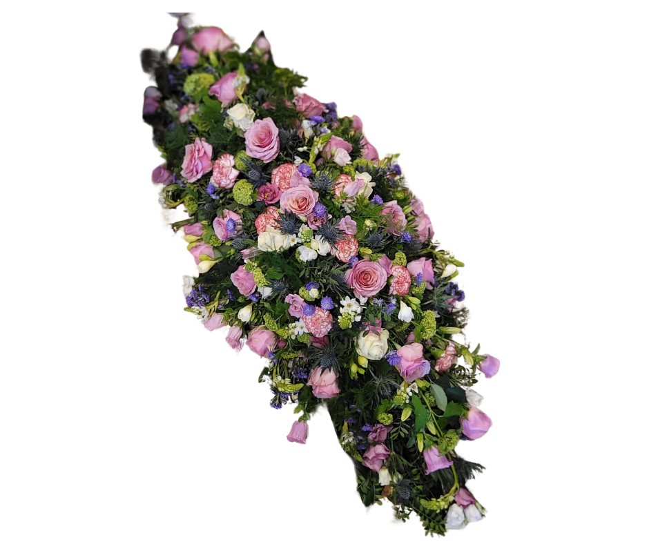 Een zacht en elegant rouwstuk in pastelkleuren dat rust en harmonie uitstraalt. De delicate bloemencombinatie weerspiegelt liefde en de schoonheid van herinneringen.