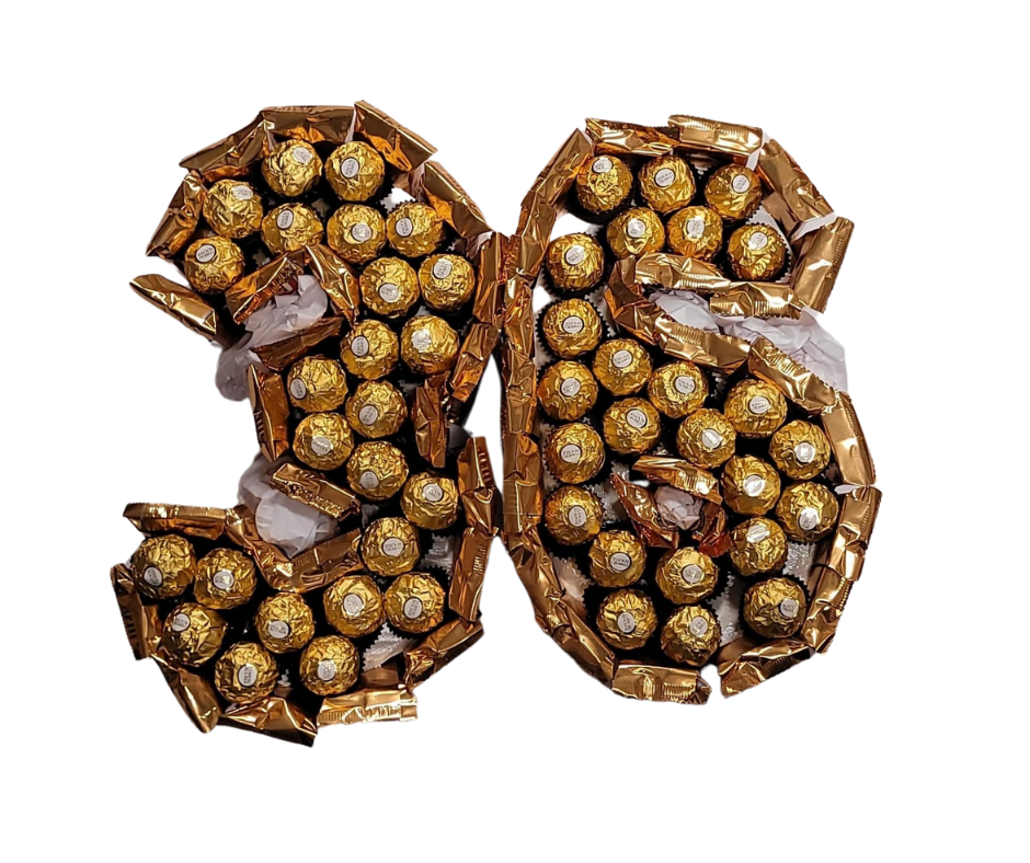 Een luxe en feestelijk cadeau dat de jarige letterlijk in goud hult! Dit pakket, gevormd in een getal naar keuze, is samengesteld uit heerlijke Ferrero Rocher-snoepjes en gouden accenten. Perfect om een bijzondere leeftijd te vieren op een stijlvolle en smakelijke manier.