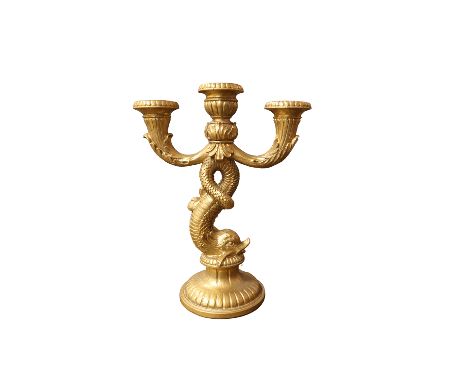 Beschrijving: Een elegante, klassieke kandelaar in goudkleur, geïnspireerd door mythologische zeethema's. Het middenstuk toont een sierlijk verweven zeeslang die oprijst uit golvende decoraties aan de voet. De kandelaar heeft drie armen, perfect ontworpen om kaarsen te dragen, en brengt een vleugje weelde en verfijning in elk interieur. Ideaal voor een maritieme of antieke sfeer.