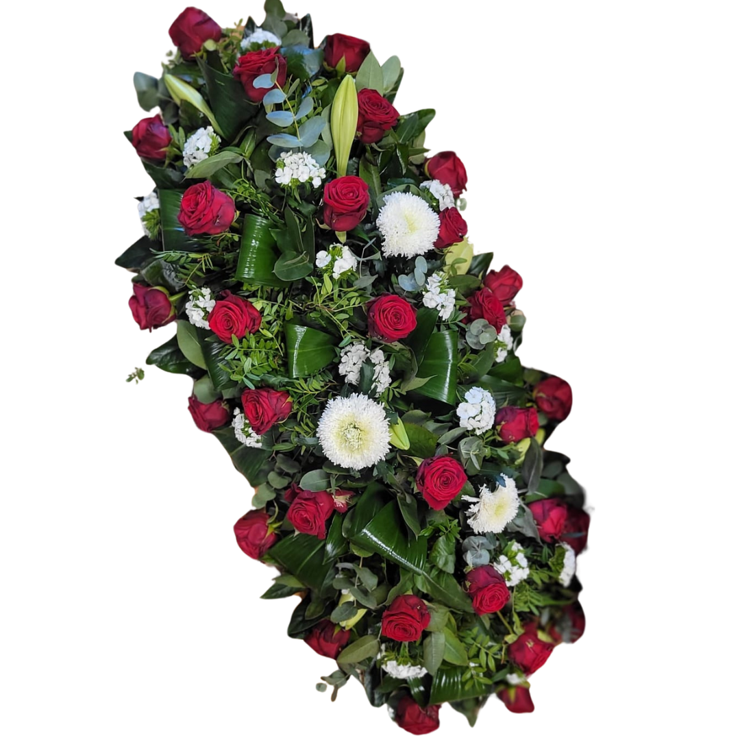Het Liefdevolle Sereniteit kist bedekkend rouwstuk straalt een tijdloze elegantie uit met zijn klassieke combinatie van rode en witte rozen. De dieprode rozen symboliseren eeuwige liefde en respect, terwijl de ivoorwitte rozen staan voor puurheid en een vredig afscheid. Het geheel wordt harmonieus aangevuld met fris groen blad, waardoor een prachtige balans ontstaat die zowel kracht als sereniteit uitstraalt. Dit indrukwekkende rouwstuk bedekt de kist op een stijlvolle en waardige manier, en biedt een ontroerend eerbetoon aan een geliefde. Een perfecte keuze om gevoelens van liefde, eer en dankbaarheid uit te drukken.