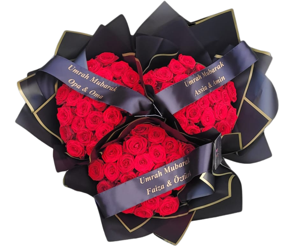 Een exclusief boeket van 25 diep rode Naomi-rozen, zorgvuldig gerangschikt in een luxe zwarte verpakking met gouden accenten. Dit stijlvolle ontwerp straalt klasse en elegantie uit – perfect voor speciale gelegenheden zoals een Umrah, huwelijk, verjaardag of jubileum. Het satijnen lint wordt gepersonaliseerd met jouw eigen tekst, waardoor elk boeket een uniek en persoonlijk gebaar wordt.