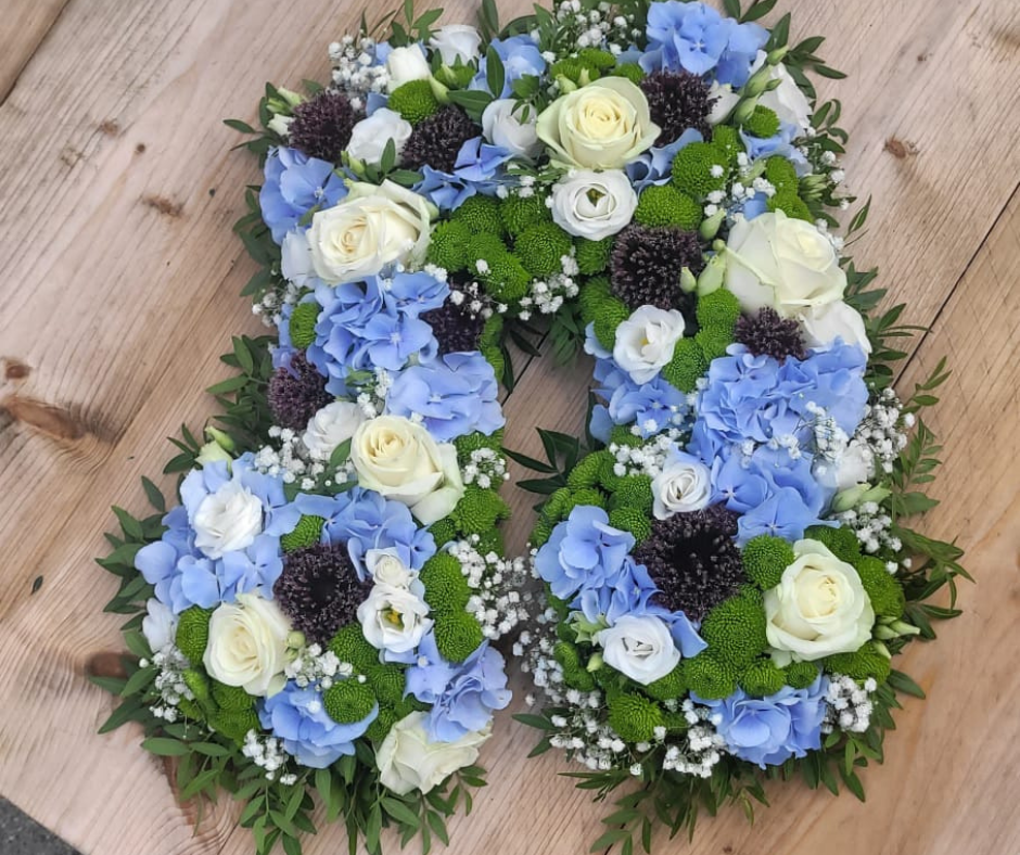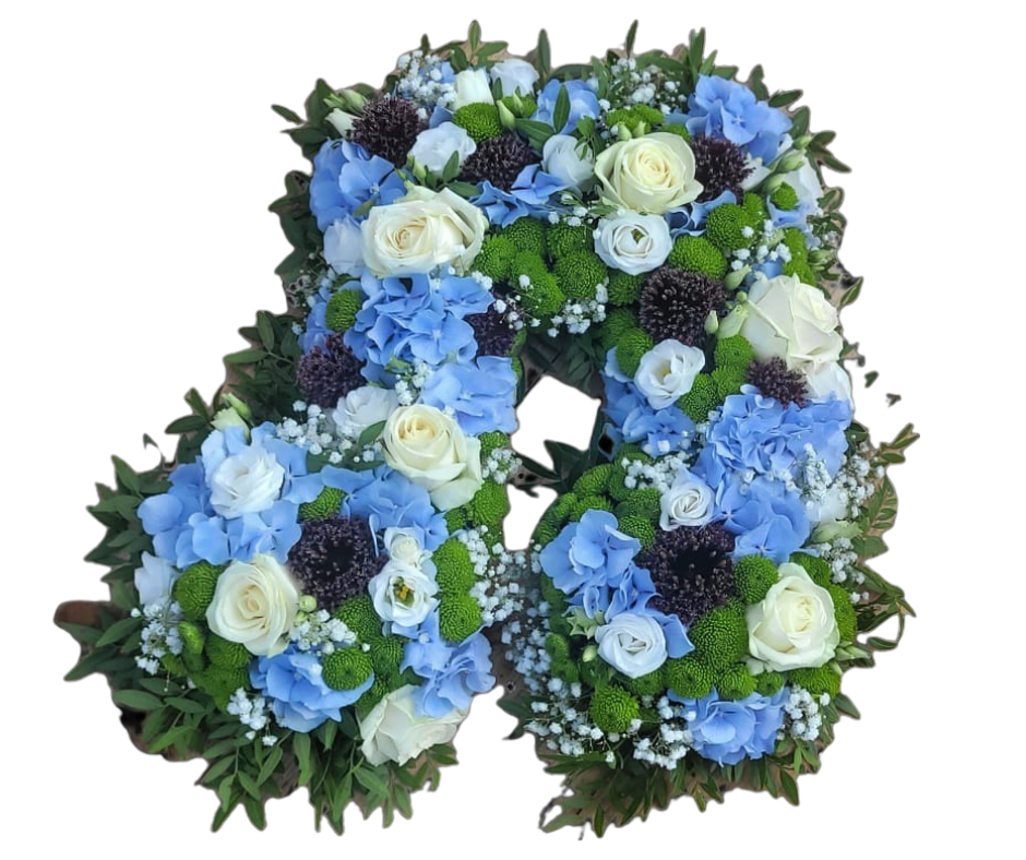 Een uniek rouwstuk in de vorm van een muzieknoot, speciaal ontworpen voor wie muziek een belangrijke rol speelde in het leven. Gemaakt met blauwe hortensia’s, witte rozen, groene accenten en diepdonkere bloemdetails voor een harmonieuze uitstraling. Met zorg handgemaakt en perfect als persoonlijk eerbetoon aan een muzikant of muziekliefhebber.