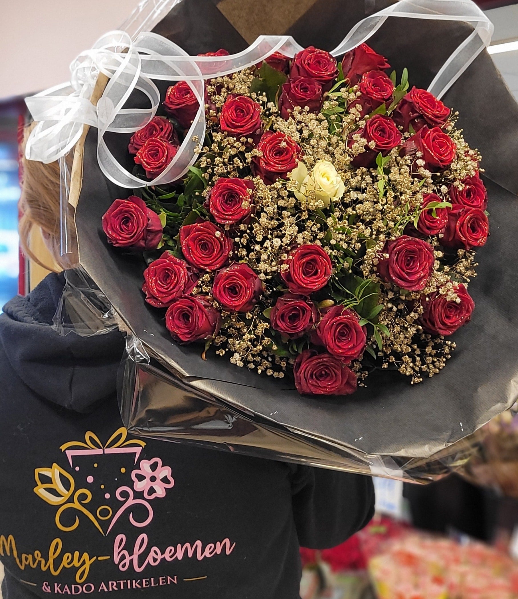 Verras je geliefde met het ultieme symbool van liefde: een luxueus boeket met rode rozen, liefdevol gecombineerd met gipskruid en een subtiel accent van een witte roos in het midden. Dit prachtige handgebonden boeket straalt passie, romantiek en elegantie uit – perfect voor Valentijnsdag, een jubileum of een speciale liefdesverklaring.