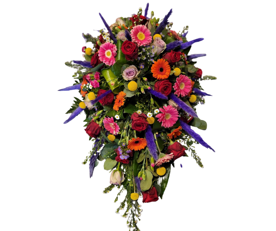 Het Regenboog Druppel Rouwboeket kist bedekkend rouwstuk is een kleurrijk en liefdevol eerbetoon aan een uniek en veelzijdig leven. Dit arrangement combineert een rijke diversiteit aan bloemen in warme en frisse kleuren, zoals levendige rozen, gerbera's, lisianthus en seizoen bloemen. De speelse schakering van tinten, van zonnig geel tot zacht roze en dieppaars, symboliseert de vele facetten van het leven en biedt een troostende boodschap van hoop en vreugdevolle herinneringen. Perfect om een laatste groet te brengen met een uitstraling die warmte, liefde en verbondenheid weerspiegelt. Dit kleurrijke rouwstuk bedekt de kist op een prachtige en respectvolle manier.