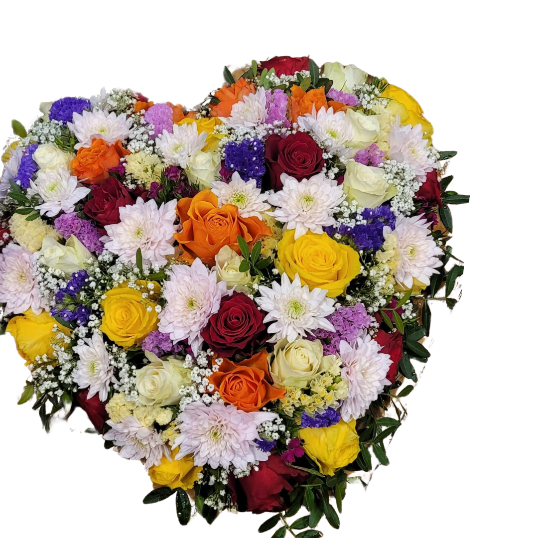 Dit kleurrijke rouwhart is een liefdevol eerbetoon, samengesteld uit een overvloed aan bloemen die troost en hoop uitstralen. De roos, symbool van liefde en respect, speelt de hoofdrol in dit stuk, met een schitterende mix van rode, gele, witte en oranje tinten. Daarnaast zorgen delicate chrysanten, baby's breath en levendig paarse limonium voor een harmonieuze en zachte afwerking.