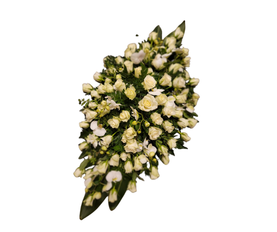Dit prachtige druppelvormige rouwstuk, Serene Witte Traditioneel Rouwboeket, straalt een tijdloze schoonheid en rust uit. Het is samengesteld uit een overvloed aan delicate witte rozen, symbolen van zuiverheid en eeuwige liefde, gecombineerd met elegante witte orchideeën die staan voor troost en bewondering. Het geheel wordt omlijst door fris groen blad, wat een natuurlijke en serene balans creëert. Ideaal om een liefdevol en stijlvol afscheid te eren, dit rouwarrangement drukt op subtiele wijze medeleven en herinnering uit.