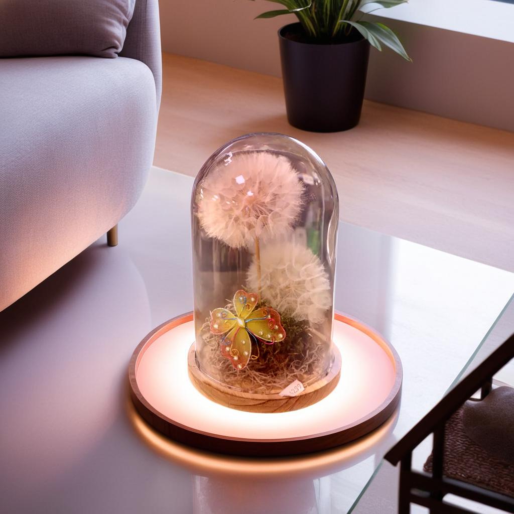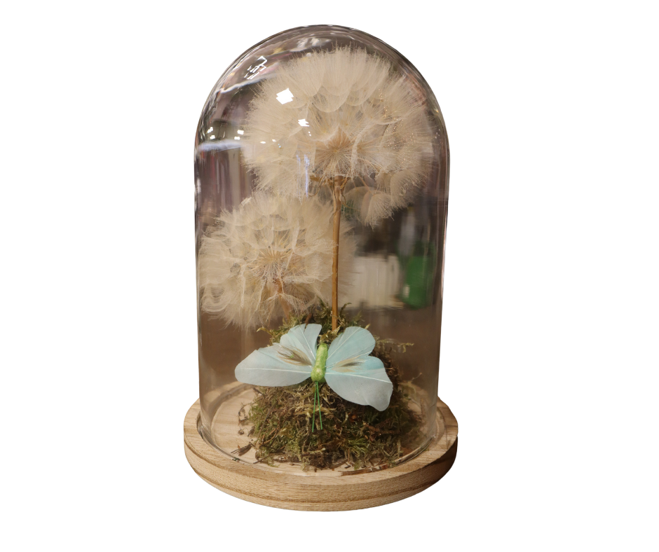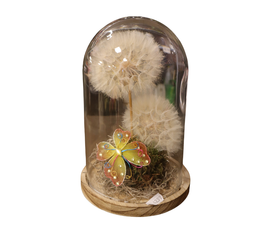Deze betoverende stolp vangt de magie van de natuur in één decoratief kunstwerk. Twee grote, delicate paardenbloempluizen lijken bijna te zweven, als gevangen wensen in een glazen bol. De kleurrijke vlinder voegt een speels en vrolijk accent toe, alsof ze net even is geland om uit te rusten. "Sprookjesbol" brengt een vleugje fantasie en sereniteit in je interieur en herinnert je eraan dat schoonheid in de kleinste details zit. Perfect om neer te zetten op een bijzettafel of in een kast voor een zacht, magisch tintje!
