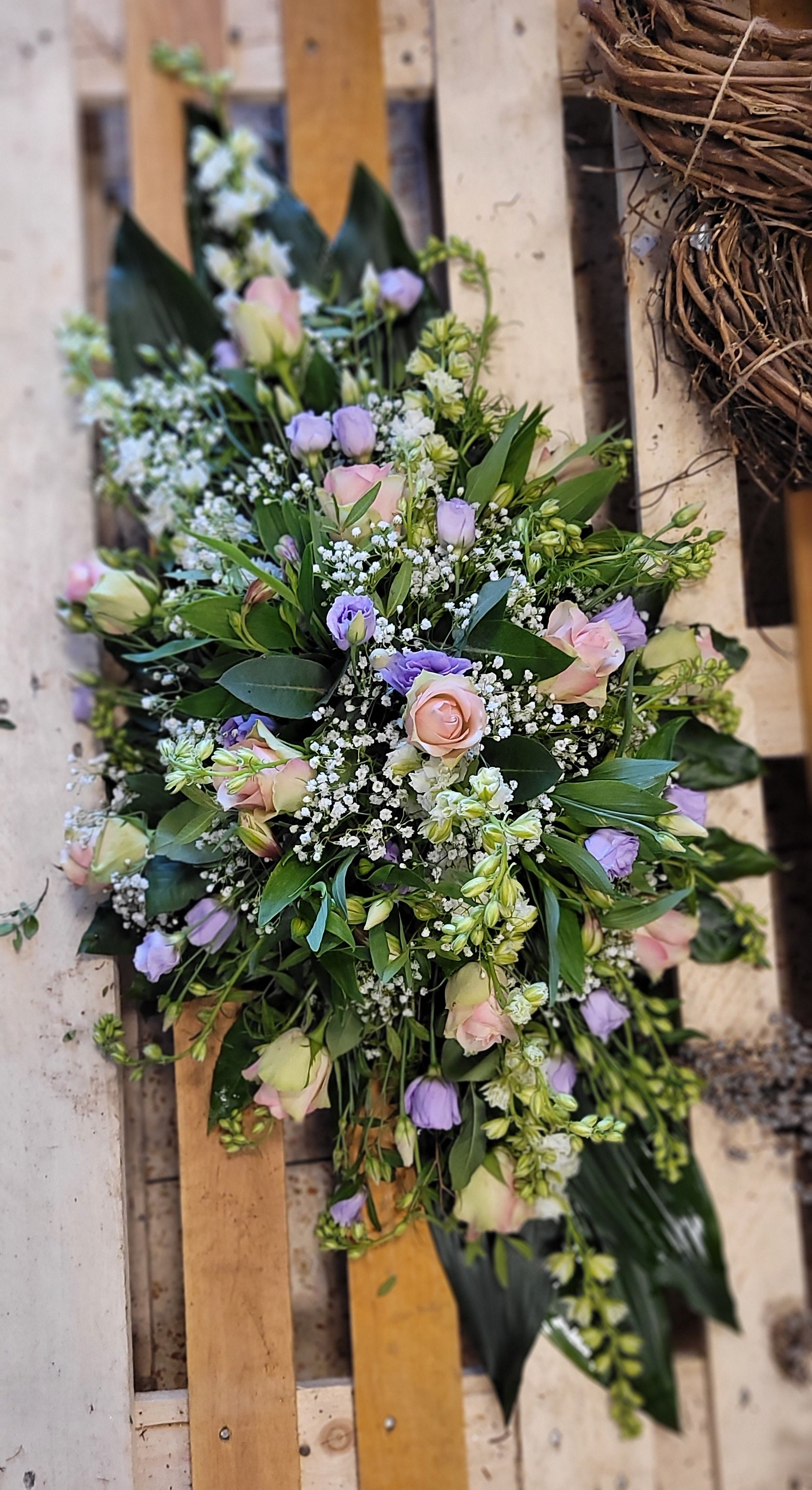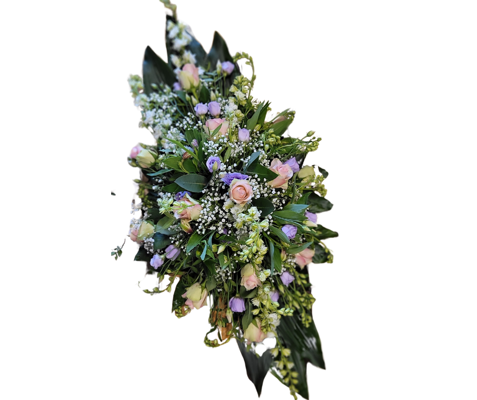 Een traditioneel en zacht rouwwerk met pastelkleuren die liefde en tederheid uitdrukken. Het ontwerp biedt troost en symboliseert mooie herinneringen.