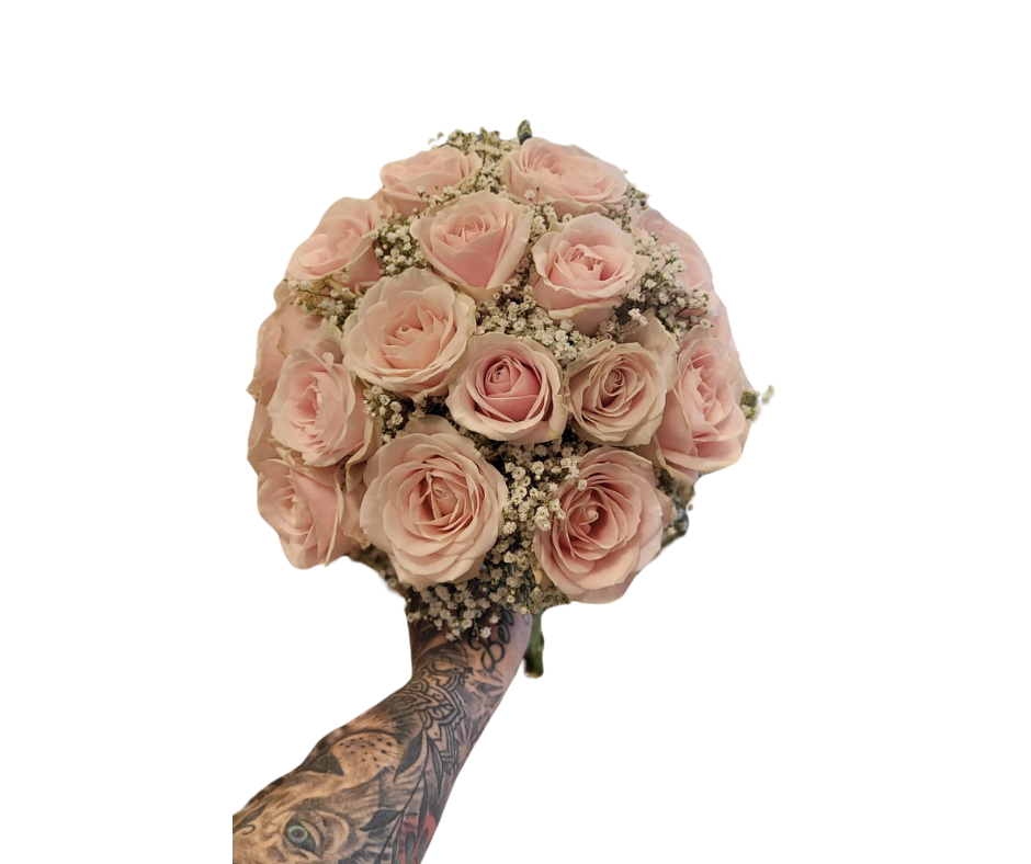 Een prachtig bruidsboeket met zachtroze rozen en fijne gipskruiddetails. De perfecte keuze voor een elegante en romantische bruiloft.