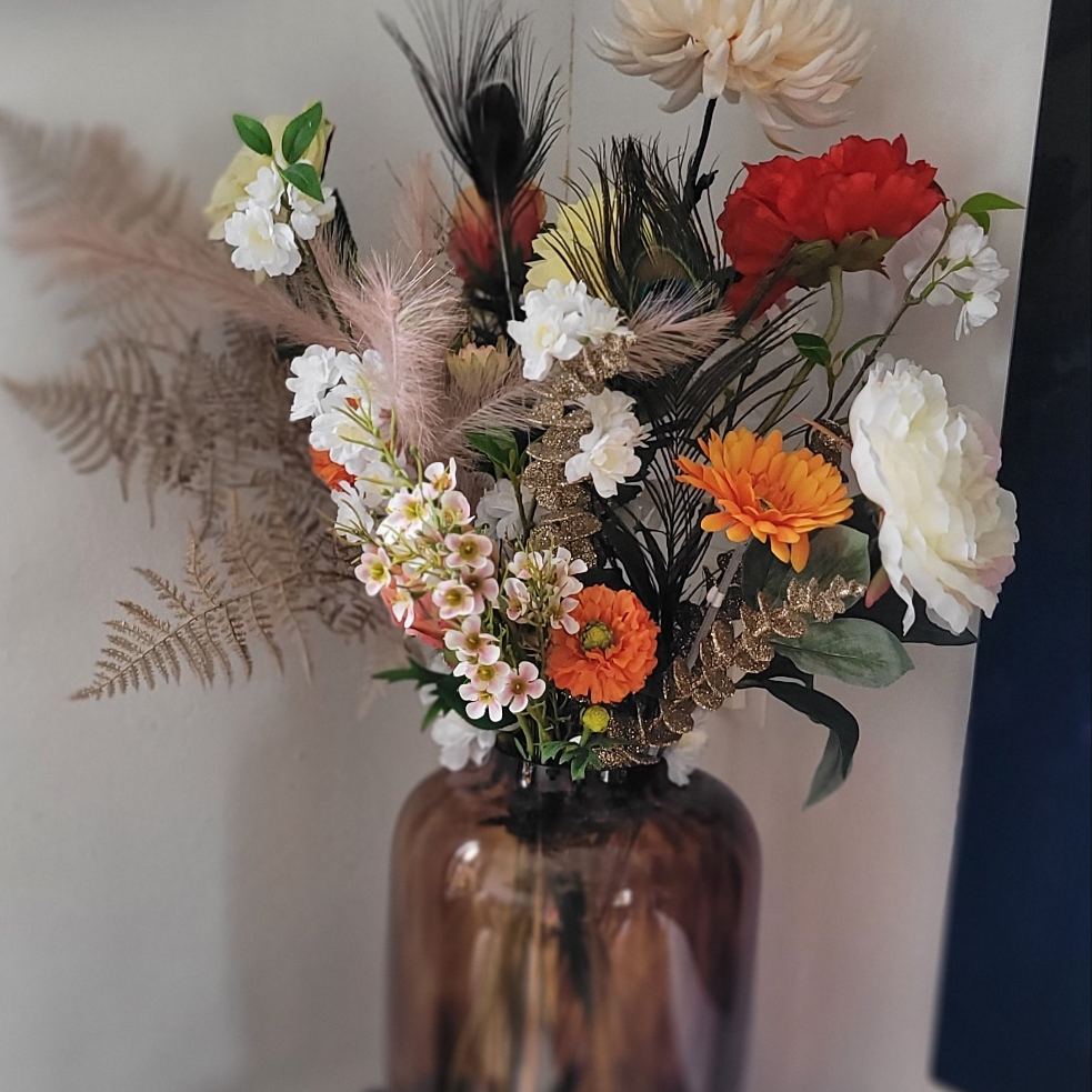Een adembenemend zijden boeket in een elegante, amberkleurige panter vaas. Dit arrangement combineert zachte pasteltinten met rijke herst accenten, aangevuld met verfijnde veren en sierlijk groen. Een duurzame en luxe blikvanger die sfeer en klasse brengt in elk interieur.
