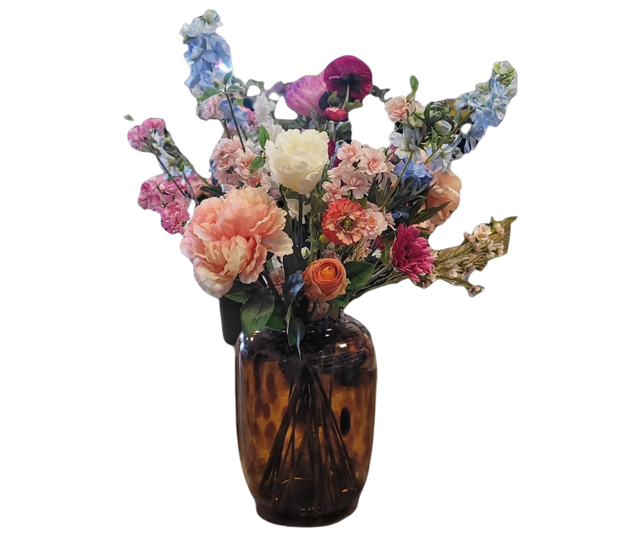Breng een stijlvolle luxe vibe in huis met ons zijden boeket Savanne Chic. Deze handgebonden compositie combineert elegante zijdebloemen in zachte pasteltinten met levendige accenten van paars, blauw en oranje. De bijpassende panterprint vaas voegt een stoer randje toe aan dit verder romantische arrangement. Perfect als eyecatcher in je woonkamer of als uniek cadeau dat geen water nodig heeft.