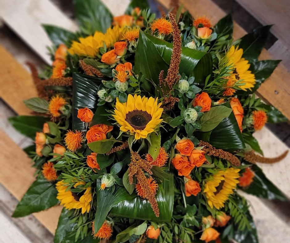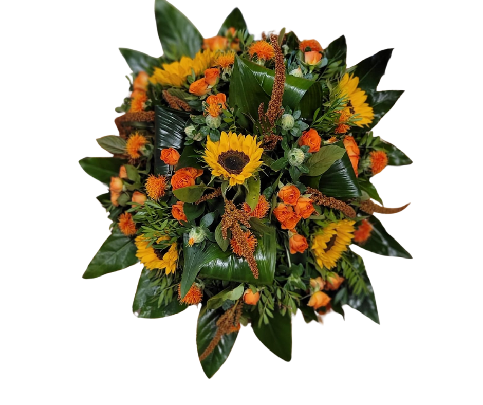 De Zonsondergang Herinnering Biedermeier is een warm en levendig rouwboeket dat het leven viert. Met zijn zonnebloemen en oranje tinten brengt dit arrangement troost en dankbaarheid tot uitdrukking.